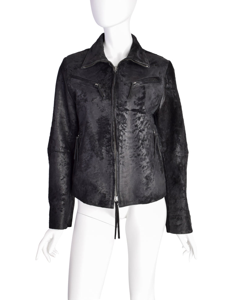 Moody and breathtaking vintage jacket by Ann Demeulemeester, from Fall/Winer 2002, the variations of leather this collection was known for are shown here documented on the runway. This amazing piece embodies the style of a classic cafe racer jacket, with zippered pockets at the chest and hips. Featuring an edgy, raw and patinated leather exhibiting intentional distress and a burnout-like technique, leaving the last layer of fur/hair to the top layer of the untreated leather - creating an incredibly cool and unique effect. Dual way zippered front closure that you can zip from the top or bottom. Black quilted lining.