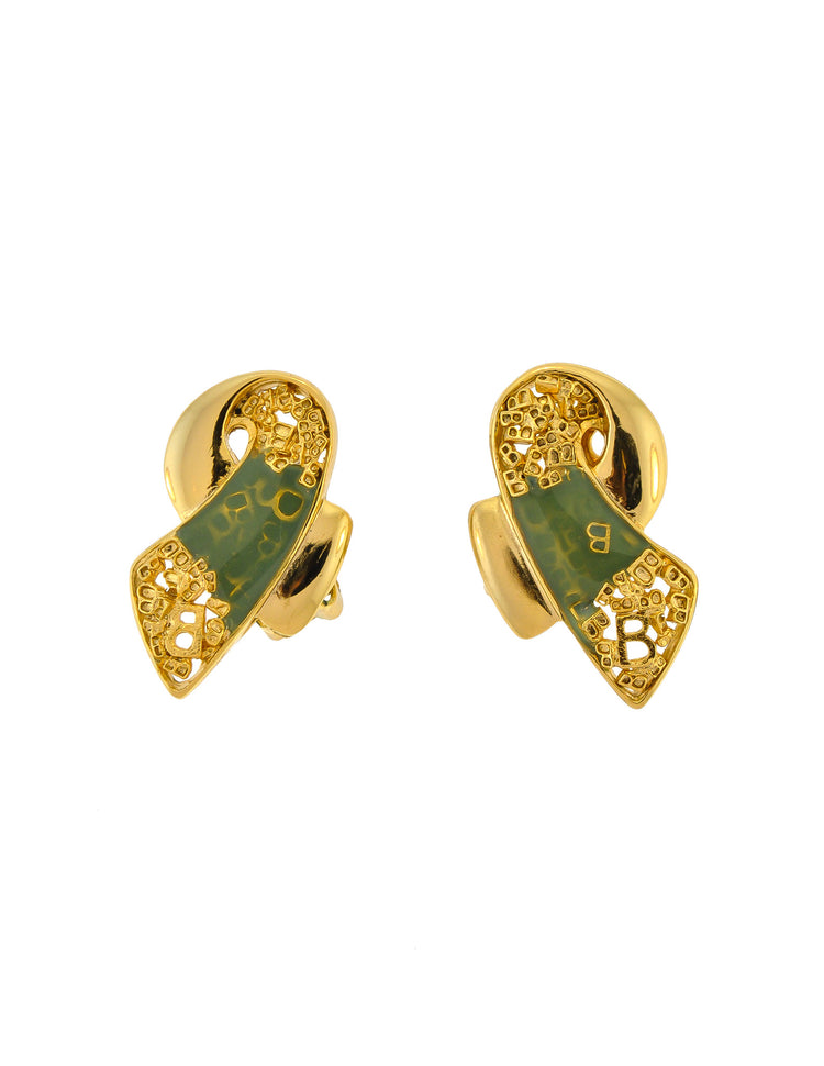 Very cool vintage Balenciaga earrings. Gold tone twisted ribbon look with dark mint-seafoam enamel center. Cut out relief that features the letter B continuously. Clip on back.