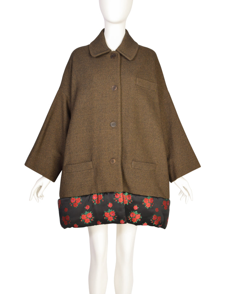 Incredible and ultra rare vintage coat by Callaghan, from FW 1990. This piece, designed by Romeo Gigli, features elements that both Gigli and Callaghan were loved for. Unusual green-brown color wool, featuring a puffy black satin trim with bright red, pink, and green rose floral brocade. An oversized a-line fit. Button up front. Decorative pocket at chest, as well as two functional pockets at hips. Fully lined in brown acetate.