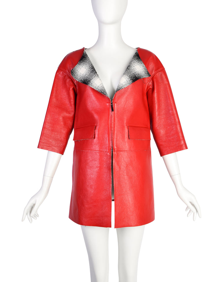 Remarkable future vintage Chanel coat from Spring/Summer 2013, shown here on the runway. Vivid cherry red lambskin leather with a crinkled effect. Fully lined in black and white silk tweed. Boxy cut with partial zip up front. Intentionally raw, frayed edges. Two flap pockets at front, one short and one deep, as well as pockets at the hip. Side slits. Cropped sleeve. An amazing Spring/Summer wardrobe staple.