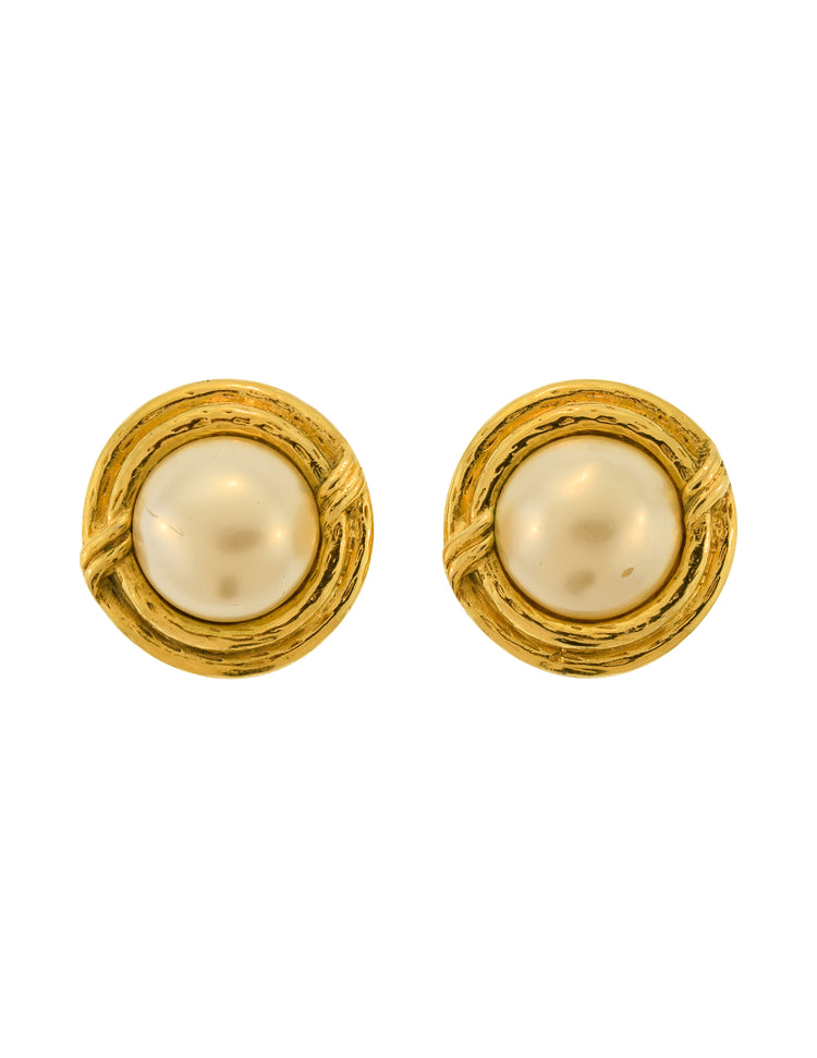 Iconic and classic vintage Chanel earrings from the 1980s. Textured and detailed gold plated frame setting. Faux pearl center. Large size. Clip on, signed back.