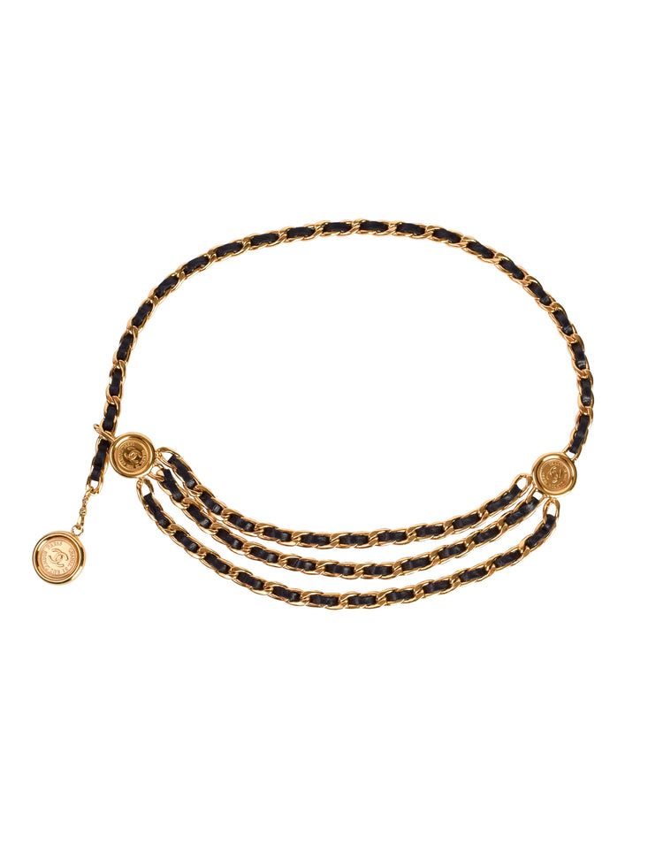 Chanel Vintage 1990s Iconic Black Leather Gold Chain Woven Triple Row Belt