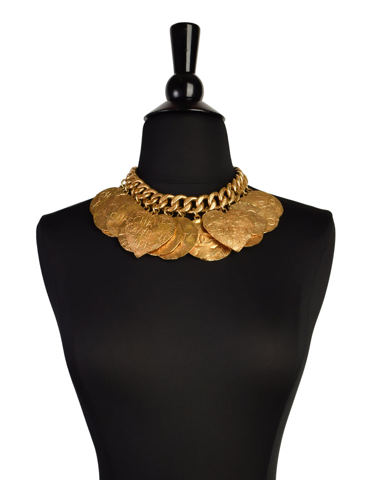 Chanel Vintage 1993 Gold Hammered Coco Egosite Cambon Large Multi Medallion Chain Necklace