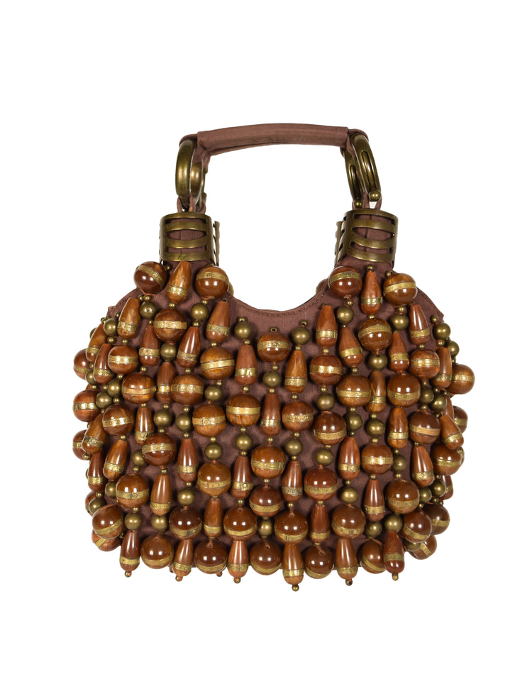 Wild, incredible vintage bag from the early 2000s by Chloe. From one of Phoebe Philo's first collections as creative director at the storied fashion house, this iconic bag combines Chloe's classic bohemian nature with Philo's ultra chic vision. Brown canvas adorned with marbled glass beads with rustic brass trimmings. Dual canvas top handles that feature amazing circular "clasp" hardware linked to brass caged caps. The bag is fully beaded with the exception of the very bottom, however, does not stand as intended to be worn as a bracelet style bag at the wrist or elbow. Lined in sheen brown cotton with a small compact size inner pocket.