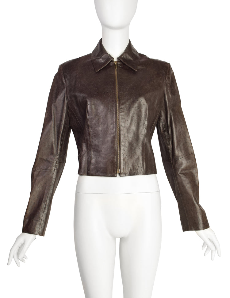 Incredible vintage Christian Dior dress, by John Galliano, from the Fall/Winter 2000 'Fly Girls' collection (example of the same leather shown on the runway here). This runway, and John Galliano's work at this time, were said to have changed the way people would dress for the coming decades. This fantastic jacket comes in a deep brown lambskin leather, with textured and dot appearance akin to ostrich. Brassy zip closure at front and cuffs. Cropped fit. Lightly padded shoulder for structure. Fully lined in brown silk.