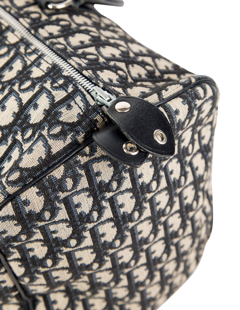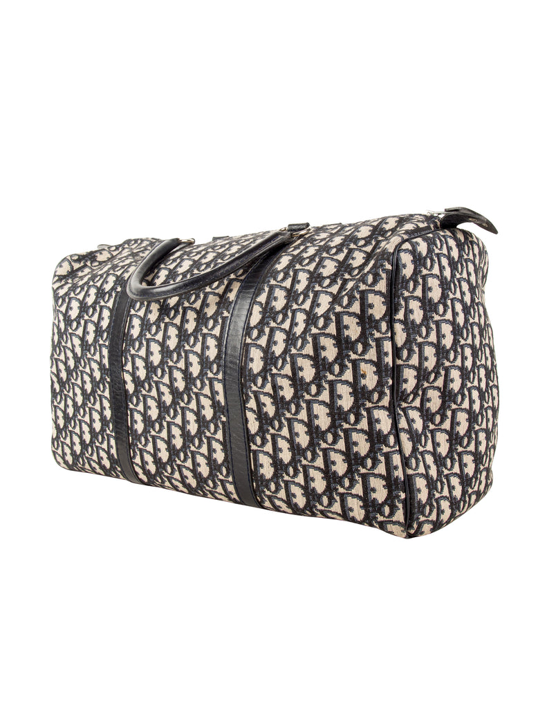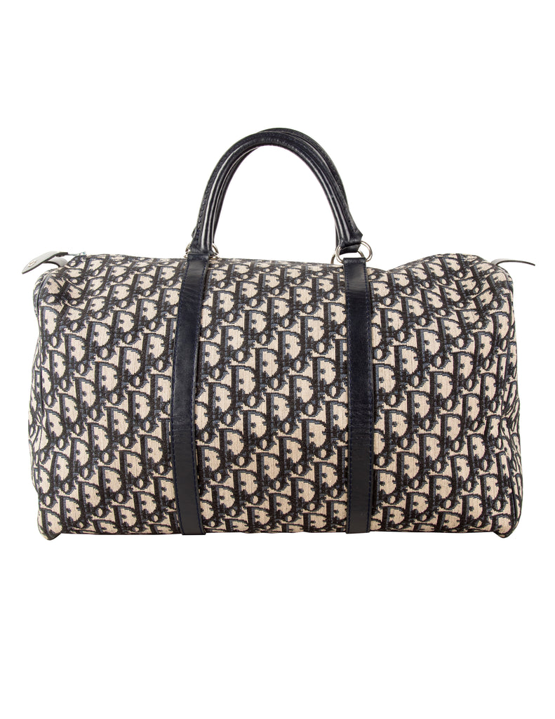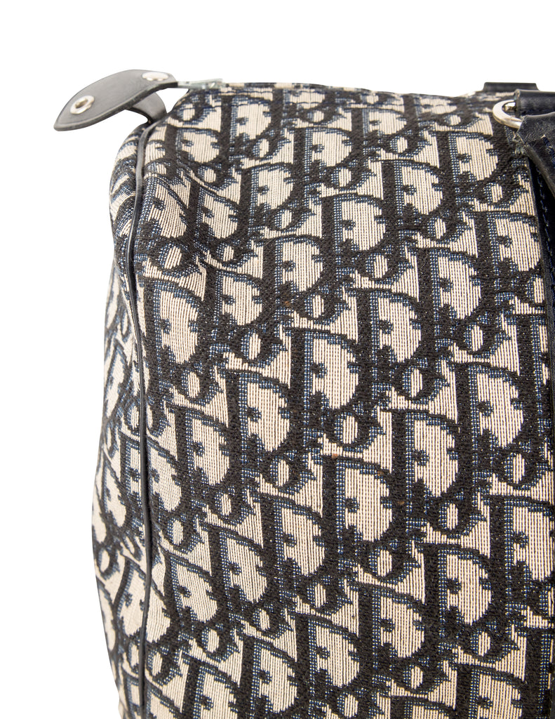 Christian Dior Vintage 1970s Navy Blue Trotter Monogram Logo Canvas and Leather Duffle Bag