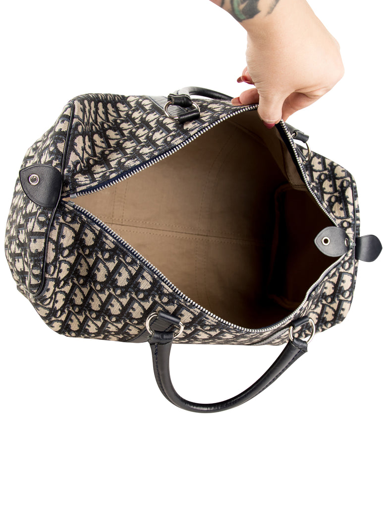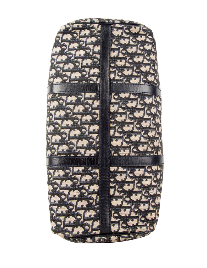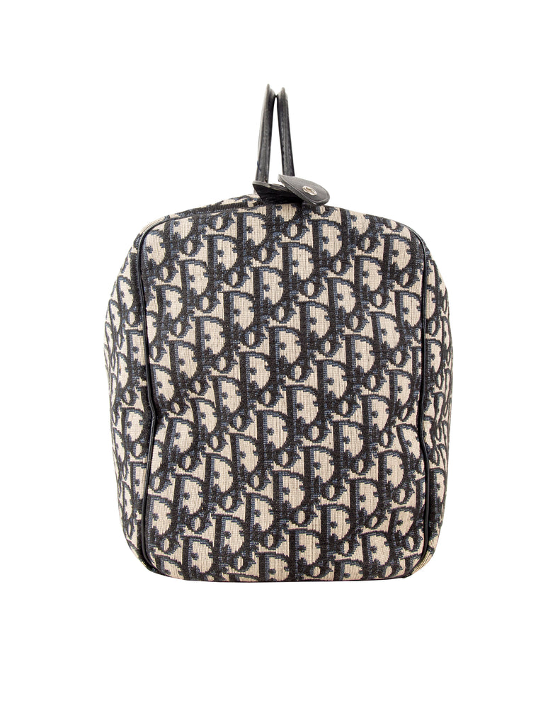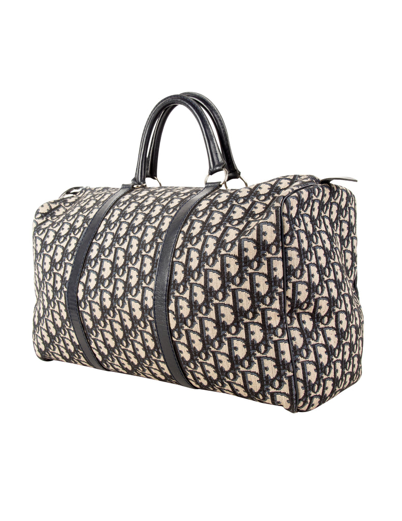 Christian Dior Vintage 1970s Navy Blue Trotter Monogram Logo Canvas and Leather Duffle Bag