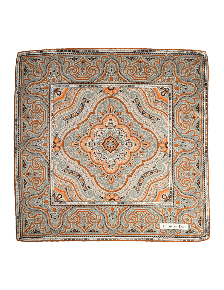 Christian Dior Vintage 1970s Orange Mint Black Intricate Paisley Print Silk Scarf