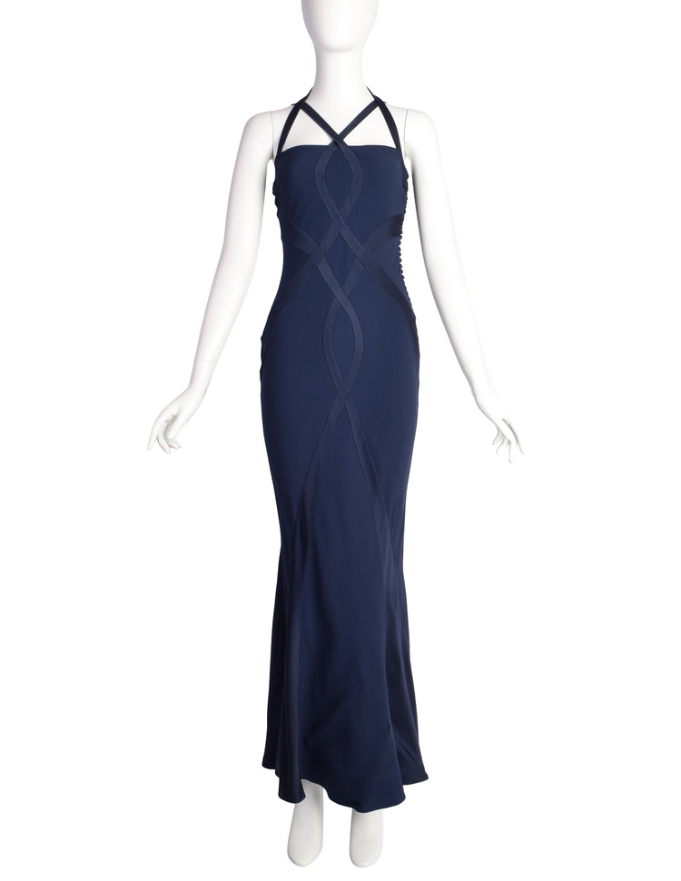 Christian Dior Vintage AW 2004 by John Galliano Navy Blue Bias Flare Silk Inlay Evening Gown