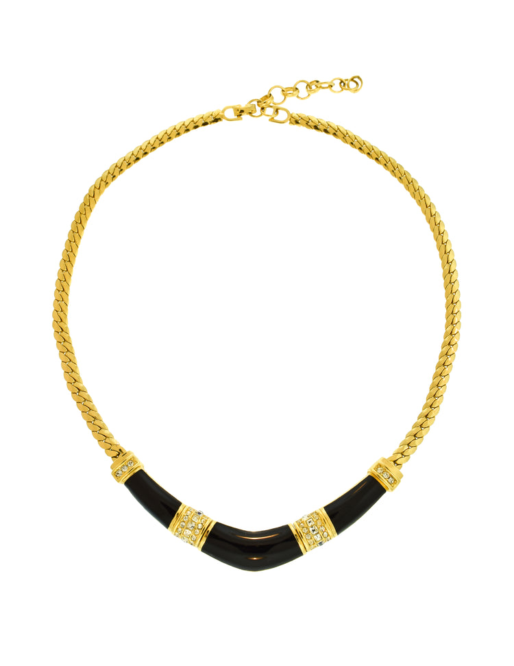 Fabulous vintage Christian Dior necklace from the 1980s. Fixed, V-shaped centerpiece adorned with polished black enamel and rhinestones. Flexible, flat golden chain. Signed box clasp closure, with adjustable chain length.
