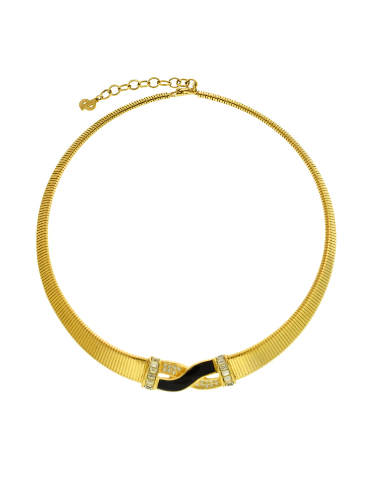 Christian Dior Vintage Gold Omega Black Enamel Rhinestone Choker Necklace