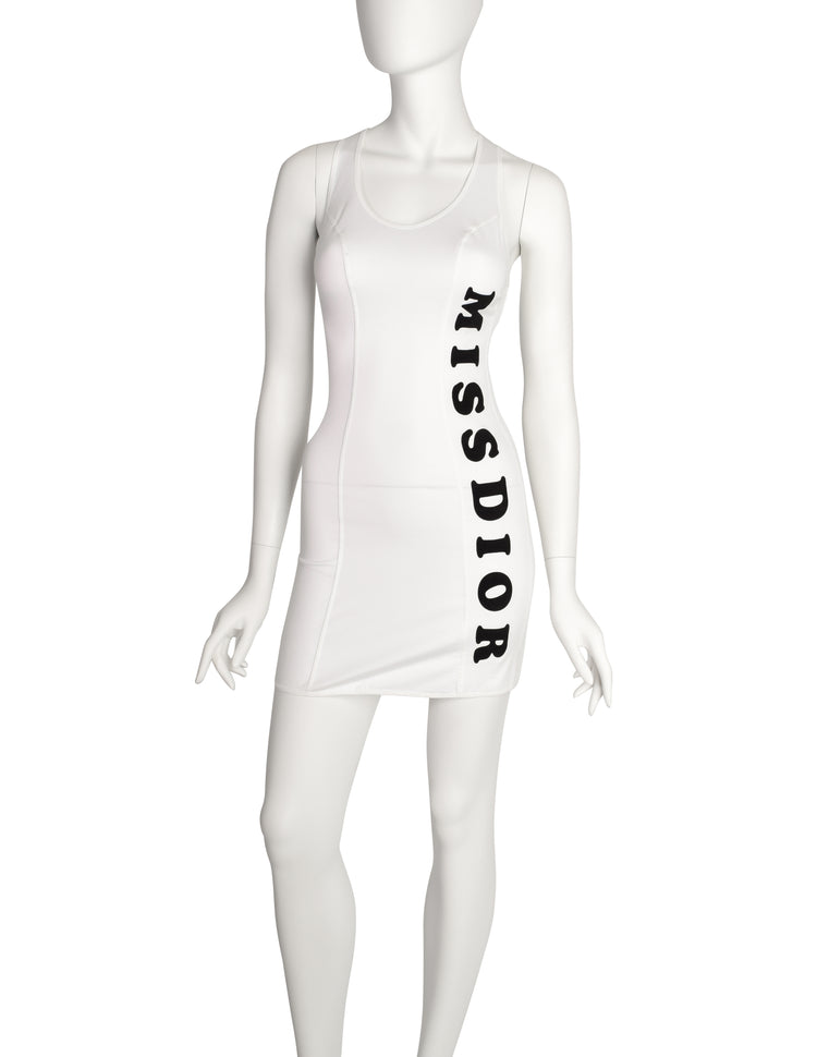 Incredibly cool vintage Christian Dior dress from Spring/Summer 2001- the Galliano era. True white stretchy cotton body con micro mini dress, with racer back and see-through mesh sides. Along the side - MISS DIOR in black felted letters. A hard to find piece in even harder to find condition.