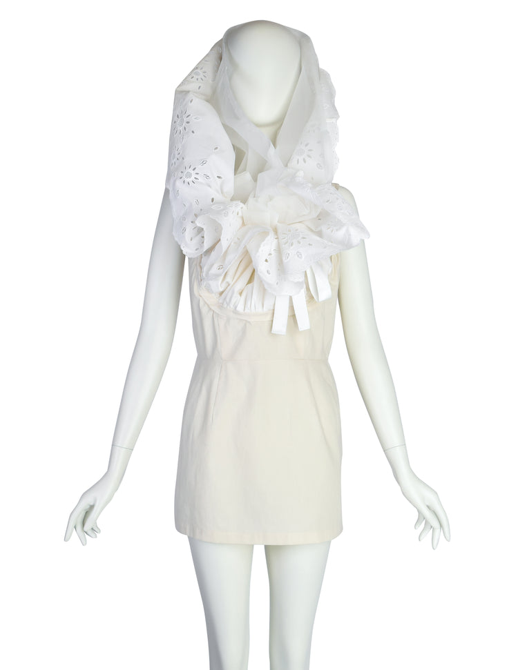 Comme des Garcons Vintage SS 2002 White Dramatic Sheer Eyelet Ruffle Head Wrap Tunic Top