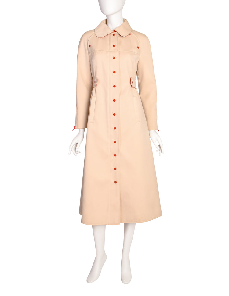 Absolutely incredible vintage coat from 1968, by Courreges. The epitome of all the Courreges created, embodying space age mod details. Creamy cotton and wool blend with bright red enamel snap button closure and snap button details throughout. Nipped waist. Two tone red/white zippers at cuffs. Bright contrasting orange wool lining. Numbered label. An incredible, collectible piece of fashion history.