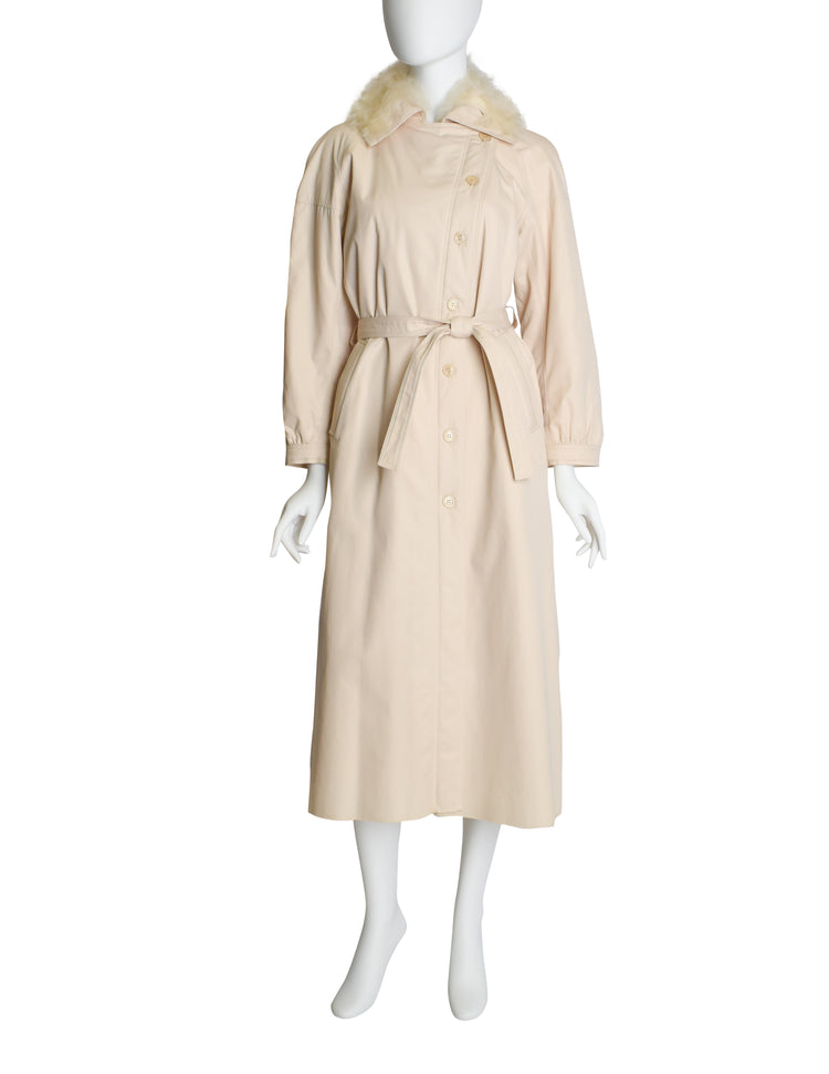 Lovely vintage early 1980s coat by Courreges. Creamy off white cotton, with padded/quilted AC monogram lining. Oversized collar with lengthy, curly lamb. Dropped shoulder. Off set button up front that closes with plastic buttons. Tied waist with matching fabric belt. Pockets at hips. Slits at each side. A lightweight coat that will still keep you warm. This item has it's original tags attached and has never been previously worn.