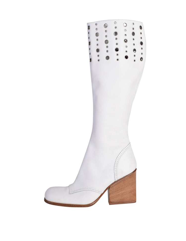 Dolce & Gabbana D&G Vintage White Leather Silver Grommet Knee High Heeled Boots