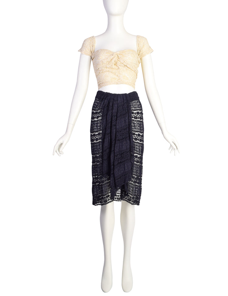 Beautiful vintage 1980s set by Donna Karan. We love a good ensemble, especially since it gives you the opportunity to wear the pieces together or on their own to maximize their potential! The lovely cropped top comes in a stretchy, intricate cream lace that ties closed. This piece can be style so many ways, tied in the back, worn back to front, and so on. We've twisted the sleeves to give it the effect you see in the photos here. Fixed twisted knot gather at the front of the bust. Comes with matching stretchy deepest navy intricate lace skirt - with a stretch band waist. Faux 'wrap' look with a gathered front that also has a layered slit. Both pieces are completely sheer/see-through. Labeled 'sample', it is possible this piece is one of a kind and never went into production.