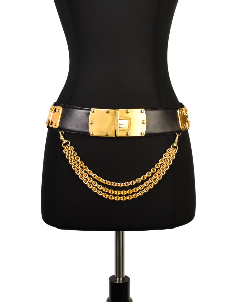 Donna Karan Vintage Black Leather Gold Plaque Chain Belt