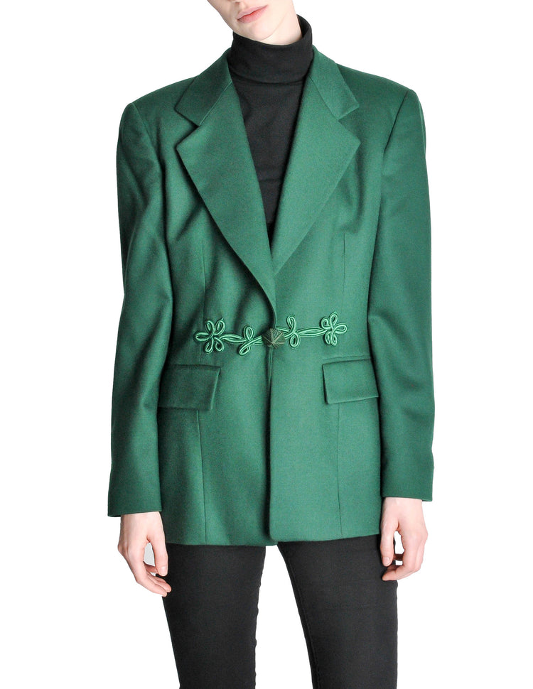 Simple, classic looking blazer from Studio 0001 by Ferré. In a beautiful hunter green virgin wool, with a gorgeous frog & triangular cone button closure. Faux pocket flaps at front hips. Featuring lightly padded shoulders. Fully lined in green nylon.