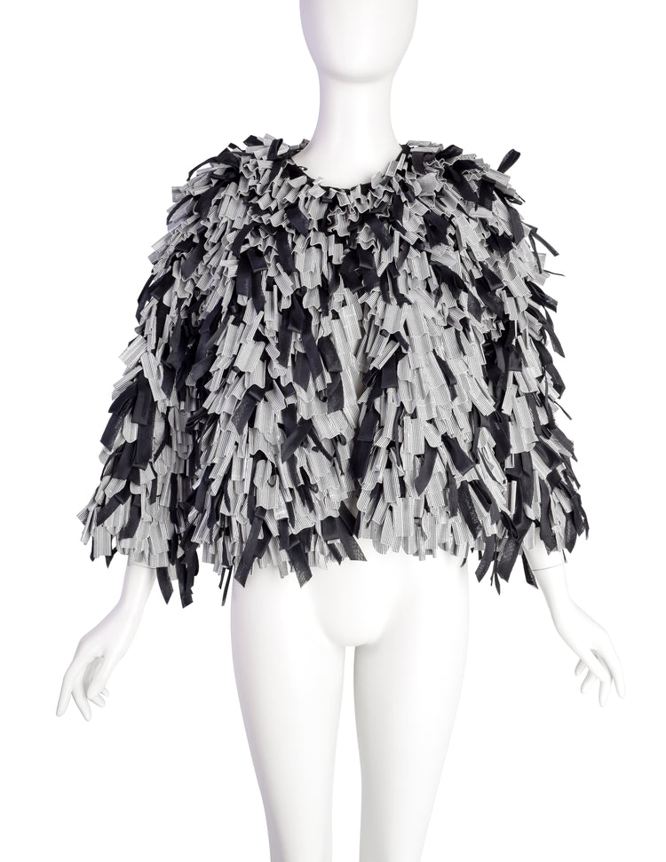 Absolutely phenomenal vintage Gianfranco Ferre jacket from the early to mid 2000s. A complete and total work of art, this mixed media piece is both a treasure to behold and wear. Circular and rectangular corrugated plastic discs, with a houndstooth print, adorn the jacket throughout, each attached by hand with beaded strand details. Hand attached, knotted strips of silk gazar span the piece as well. Underneath all of this amazing embellishment- a sturdy, medium-weight ribbed cotton blend jacket layer, fully lined in black silk satin. This cropped silhouette is incredibly versatile- layer it over a band shirt and jeans or a red carpet gown.