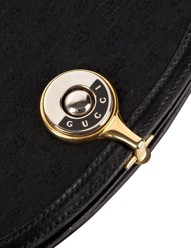 - Gold and silver circular latch closure with enamel GUCCI detail.