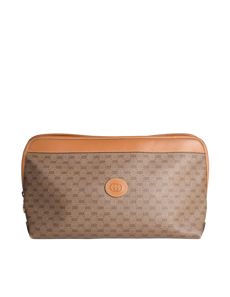 Classic vintage 1980s cosmetic travel bag by Gucci. Very large size, although seemingly intended for cosmetics, could easily be used as a clutch purse. Light brown monogram coated canvas trimmed and detailed in caramel leather. Zip around closure complete with golden GG logo zipper puller. GG embossed leather emblem at front side.