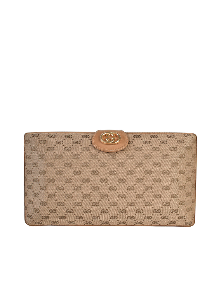 Gucci Vintage Light Brown Micro GG Monogram Canvas and Leather Hard Case Clutch with Crossbody Strap