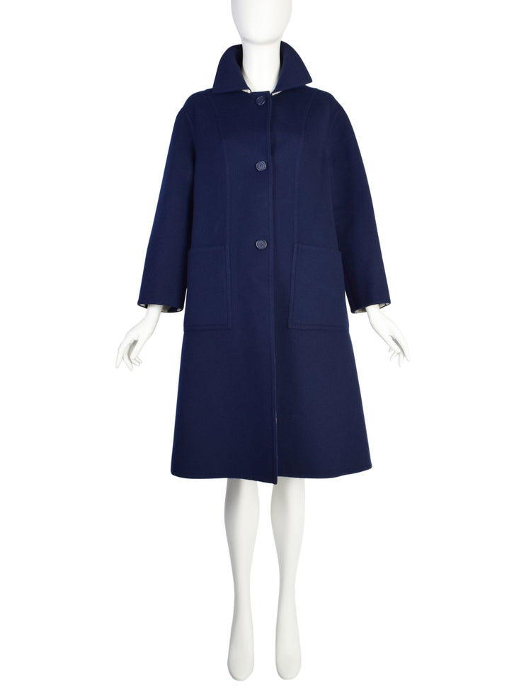 Absolutely gorgeous vintage coat by Hermes Sport, from the late 1970s/early 1970s. This simple and chic beauty comes in a stunning shade of navy blue wool and features a blue/white H patterned graphic interior and collar underside. Cutest a-line silhouette, with a button up front closure and pointed collar. Slit vent at back center. Square patch pockets at hips. This is a lifetime piece that will never go out of style.