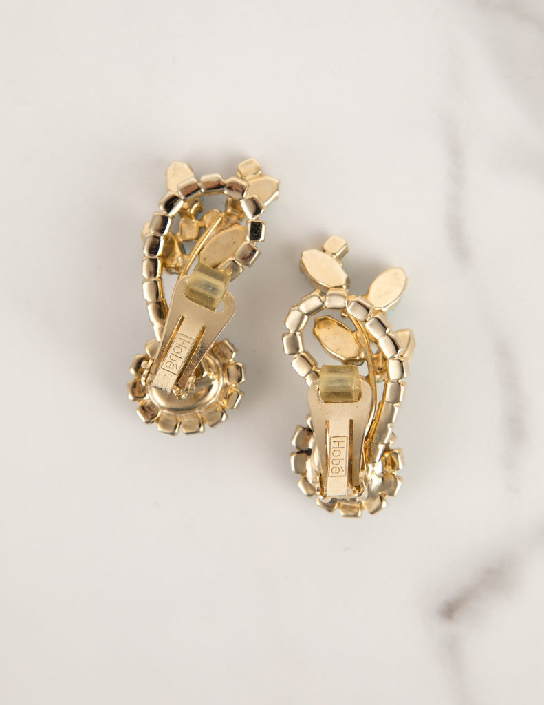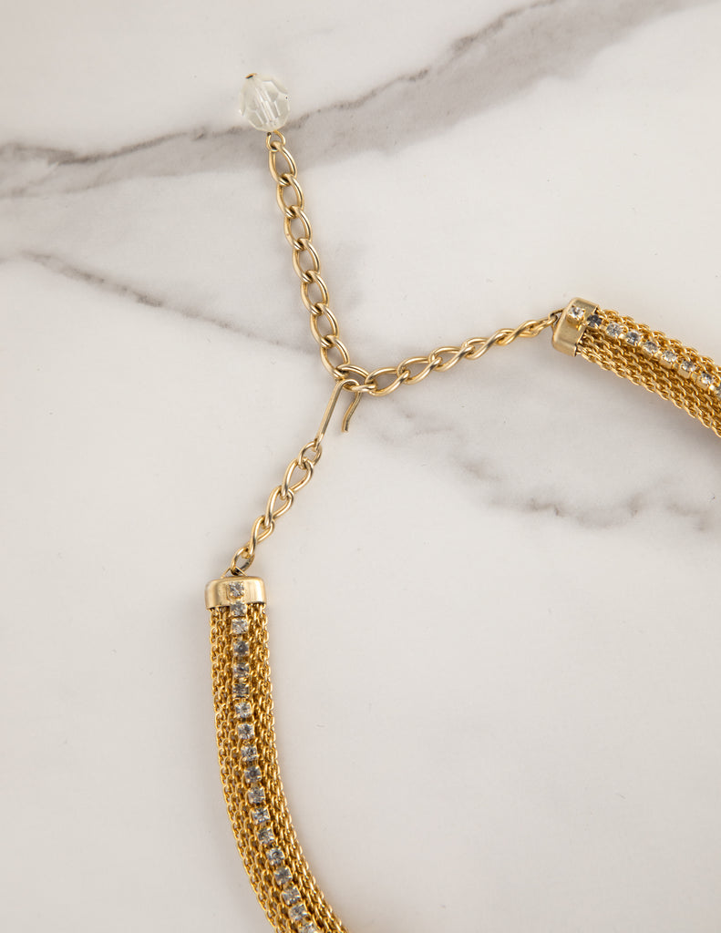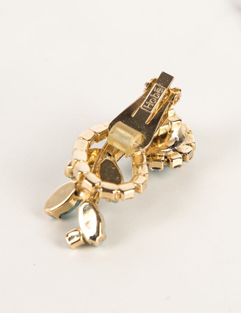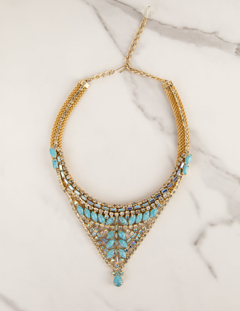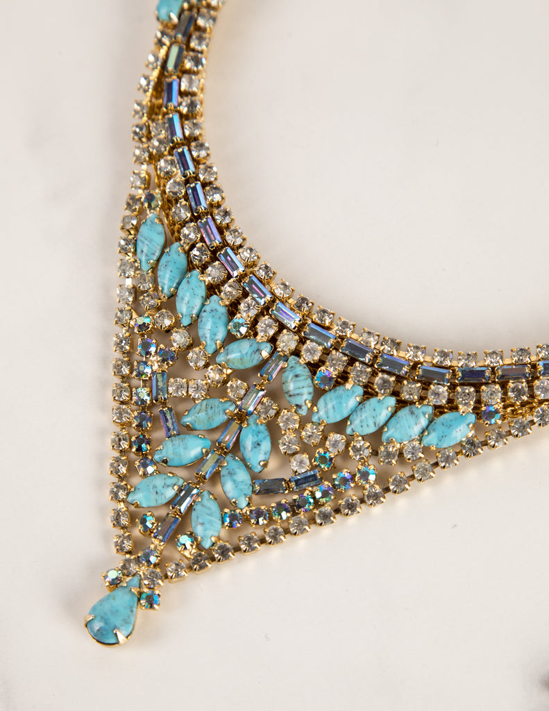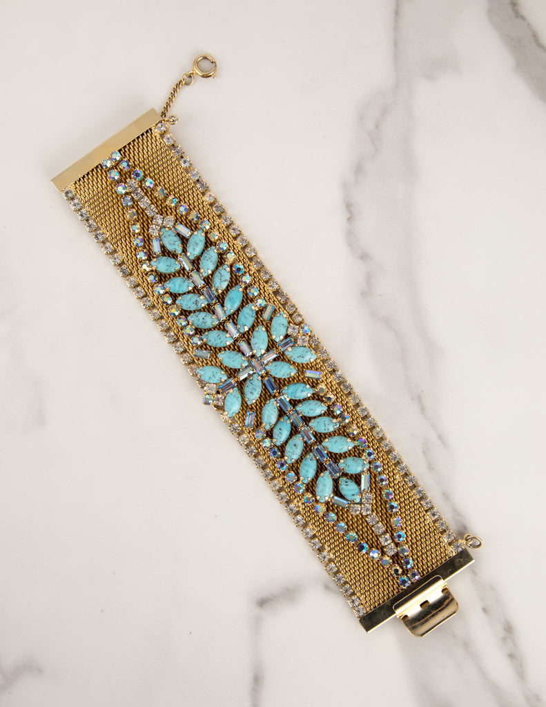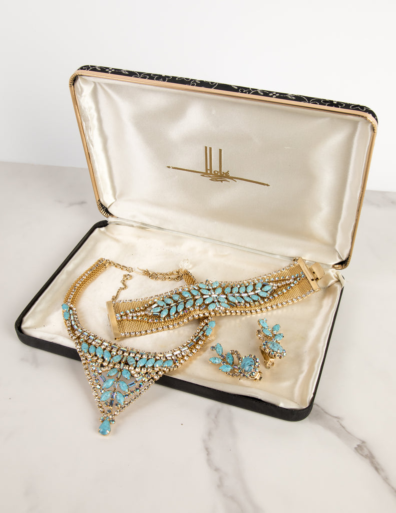 Hobé Vintage 1960s Turquoise and Iridescent Crystal Gold Mesh Necklace Bracelet and Earring Set