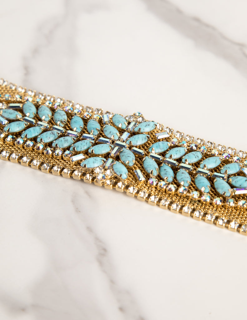 - Matching necklace, bracelet, and earrings, comprised of turquoise-like cabochons, clear and iridescent rhinestone and baguette crystals.