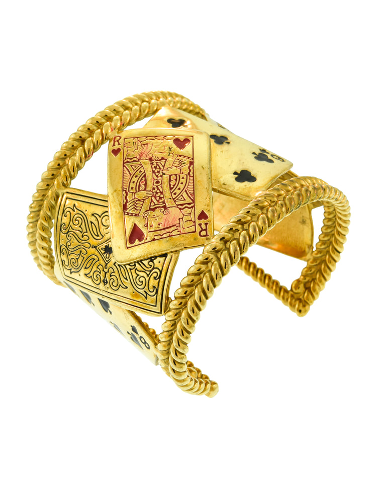 Incredible vintage 1980s Poker cuff by Isabel Canovas. Canovas' jewelry is about as rare as it gets, with the high quality to match. This wonderful bracelet features various playing cards/suits spanning the wrist, adorned with both black and red enamel details. Cutout elements throughout. The outer wrist and edges framed in a braided motif. Slides on wrist via the slit opening at the backside. We're in love with it, and you will be too! The ultimate conversation piece - no poker face needed here, all the other players will be distracted by this beauty.