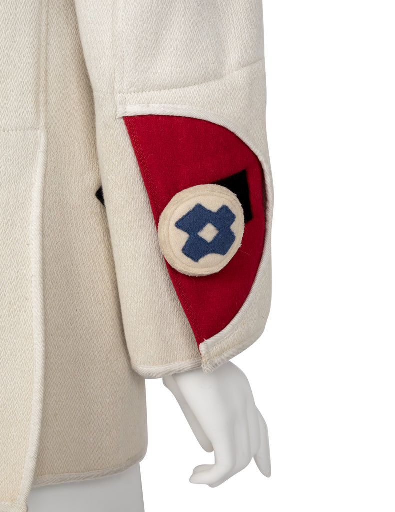 Condition: Good/Fair Condition. Presents beautifully, with so much life left to give! However, there are signs of wear throughout the ivory wool - minor darkening here and there, minor/faint treated spots, minor marks, and some flaws within the fabric. The buttons show artisanal/rustic wear that both intentional and from age, such as darkening to the edges. This piece is priced accordingly. Honestly, the transparency about the condition here makes it sound way worse than it is. You'll love it.