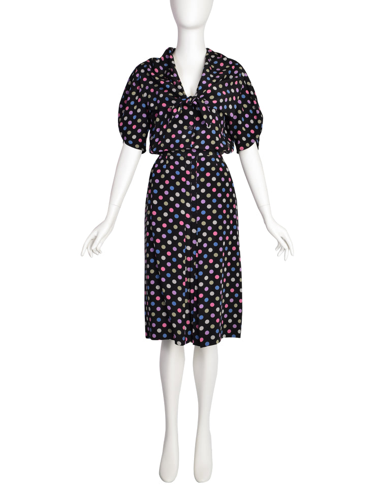 Adorable vintage ensemble by Jean Muir, circa early 1980s. Black silk with muted/pastel multicolor polka dots throughout. Gorgeous blouse features an exaggerated tie at v-neck, with pleated/puffed sleeves and button up front that has the cutest clear/pink marbled buttons. Matching skirt has pleated details, with side zipper/button closure, fully lined. Vintage sets offer an amazing opportunity to create multiple looks from one outfit, as you can wear the skirt and blouse together or on their own.
