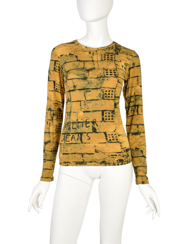 Amazing vintage Jean Paul Gaultier top, documented and shown here on the A/W 1997 runway. This shirt features an iconic, well-known graphic brick print that has graffiti such as Gaultier Jeans throughout. Mustard yellow with black and green details. Slightly stretchy viscose jersey, with long sleeves.