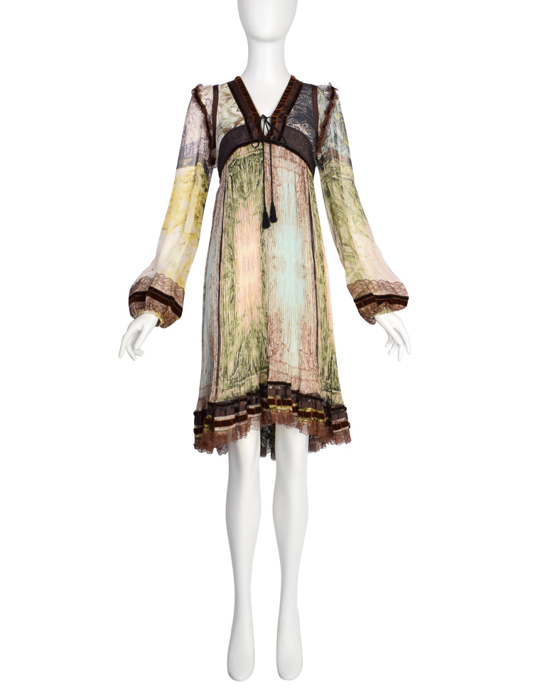Stunning vintage Jean Paul Gaultier dress from Fall/Winter 2006, shown here documented on the runway. This utterly beautiful piece features a baroque meets nouveau mixture of prints throughout in the loveliest earthy and pale colors. Varying shades of brown velvet, grosgrain ribbon, and lace trimmings throughout. Dramatic, sheer bishop sleeve with elastic cuff. Double layered, fitted bodice with V neckline, with tassel cord ties at the center. Empire wait with embroidered ribbon detail. Semi-sheer, plissé pleated skirt. Zip up closure at backside.