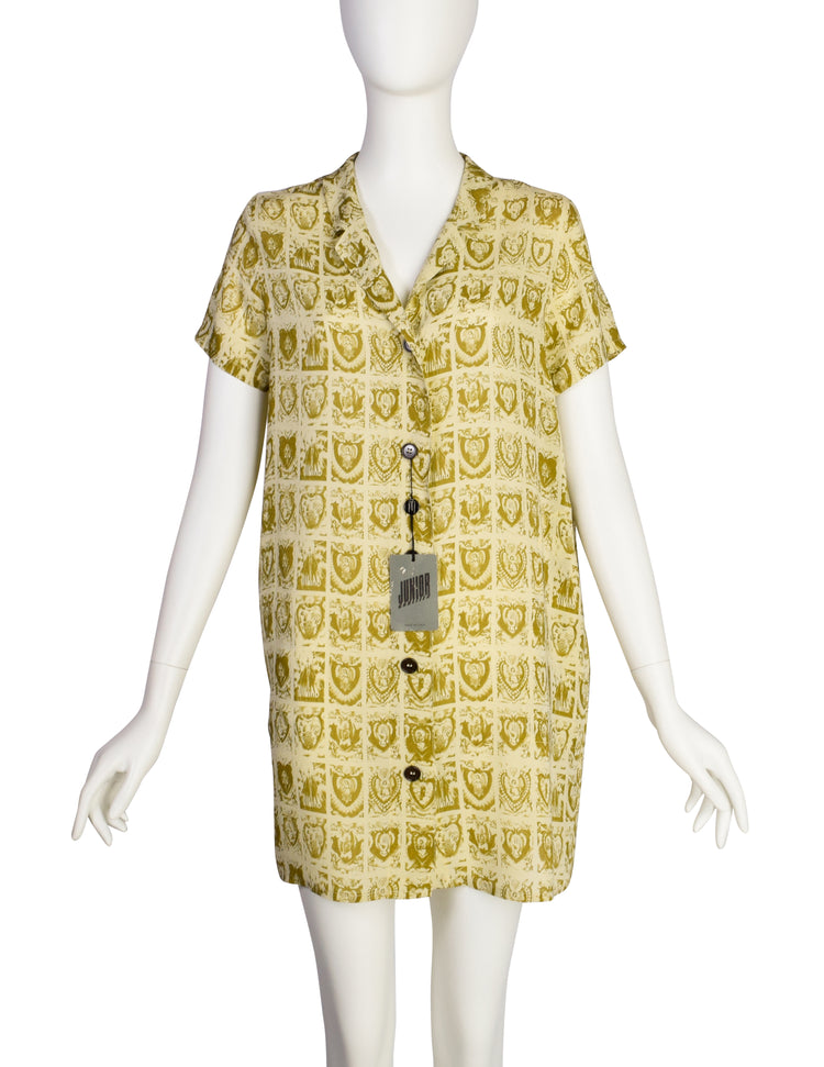 Rare and fantastic vintage Jean Paul Gaultier top, circa late 1980s. This one is a Junior Gaultier label, which was a slightly more accessible, experimental and fun line that existed from 1988-1994 and was mixed into the regular ready-to-wear runways. This piece is great- the print features a variety of sacred hearts celebrating many different religions within. The color is very cool, a yellowy based beige with a moss green throughout. Oversized, lengthy tunic style shirt that can also be worn as a mini dress. This top completely buttons up at the front and has a four point collar. Pockets at hips. Beautiful viscose fabric. This incredible piece is deadstock and has never been worn, with original tag still attached.