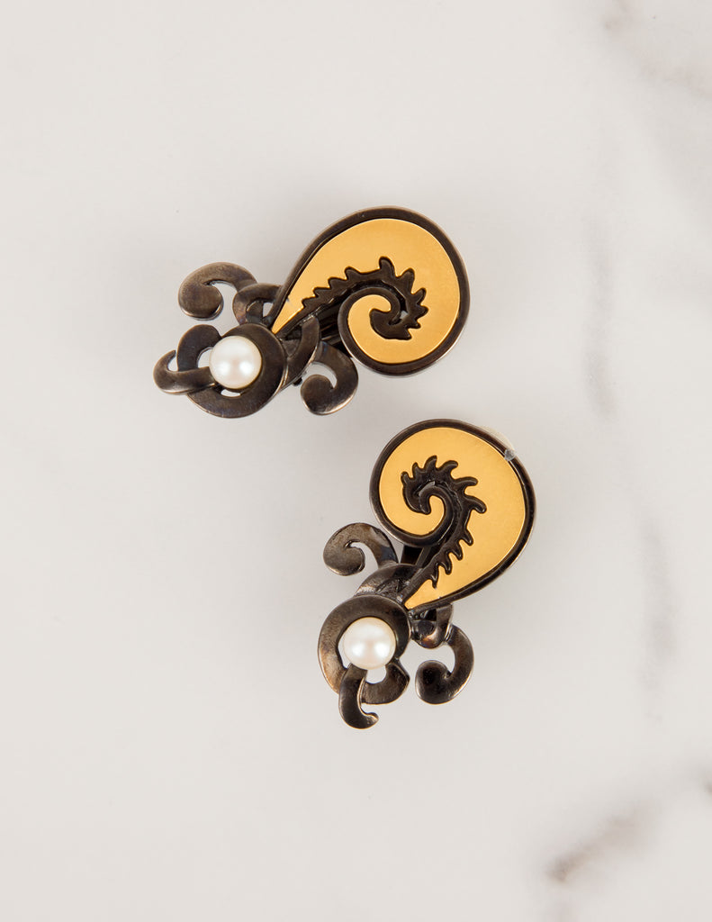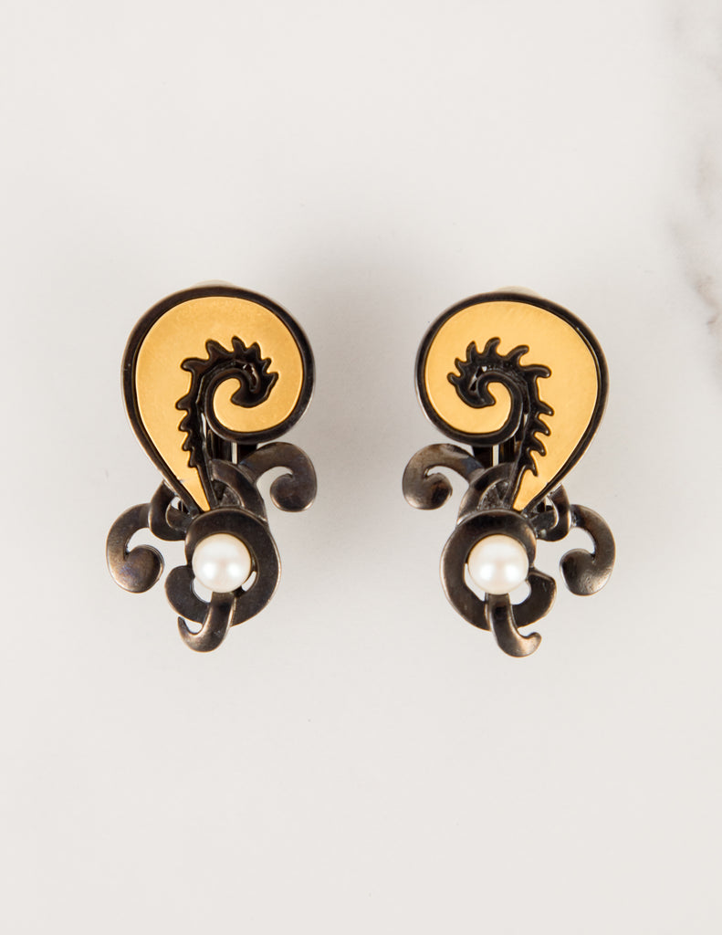 Karl Lagerfeld Vintage Gold and Gunmetal Feather Pearl Question Mark Earrings