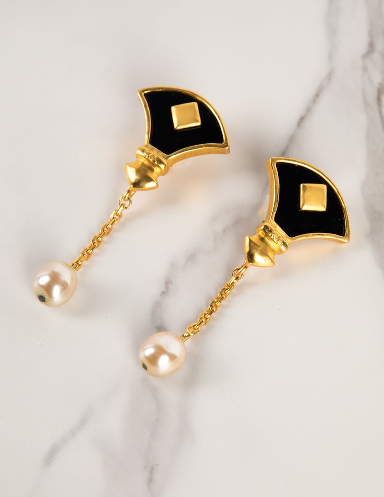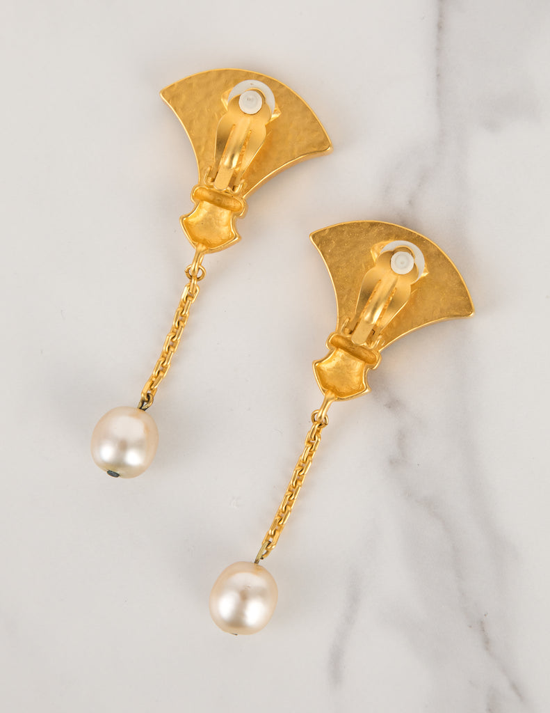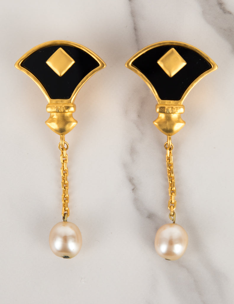 Karl Lagerfeld Vintage Gold Plated Glass Fan Dangling Pearl Statement Earrings