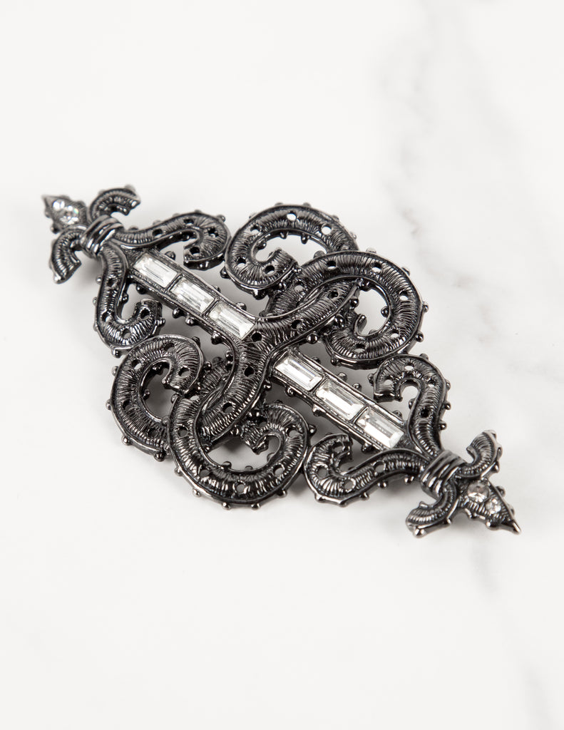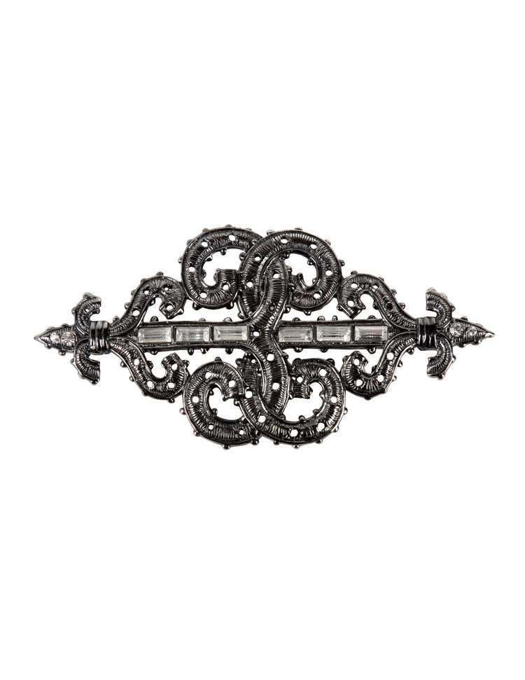 Phenomenal vintage Karl Lagerfeld brooch from the early 1990s. An intertwined motif featuring fleur de lis at each end, detailed in rhinestone crystal baguettes. Edgy gunmetal finish. Massive, statement making size. Secure pin back closure. This piece would look great worn at the center of a collar, atop a wide lapel, and beyond.