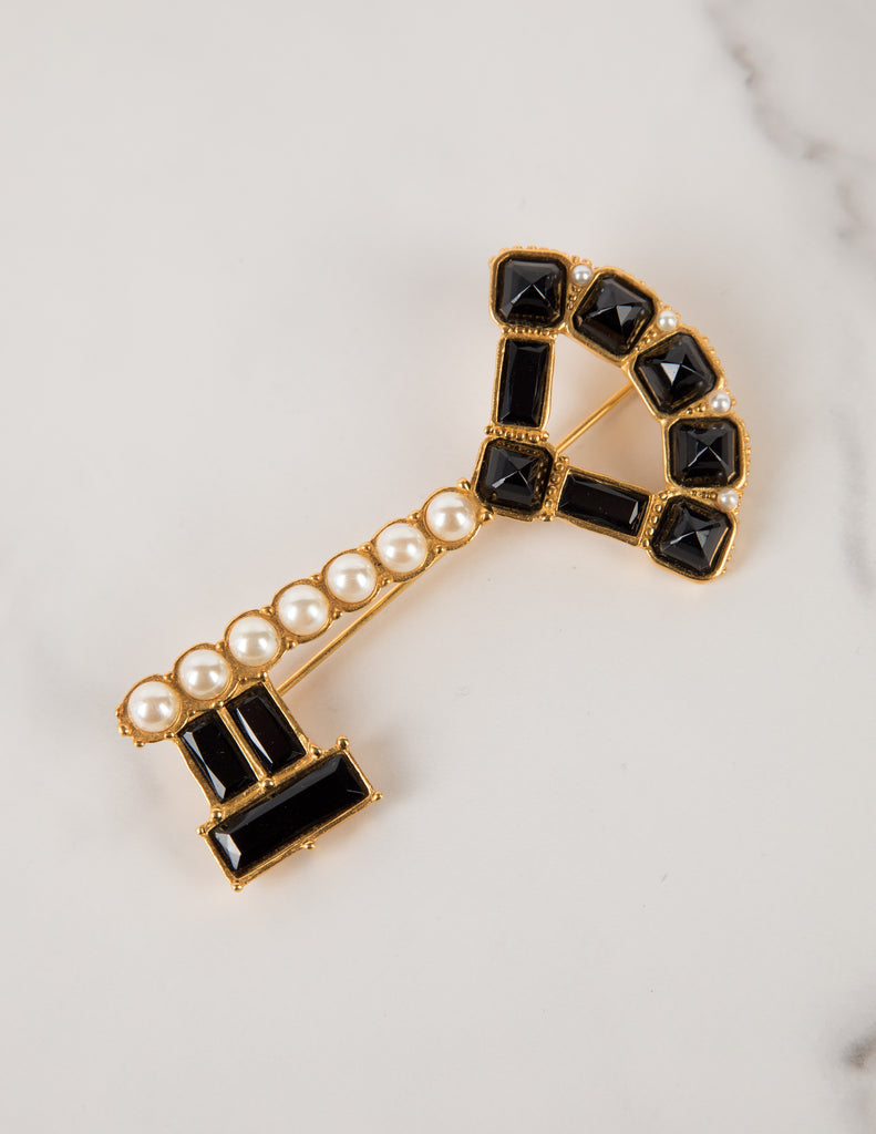 Karl Lagerfeld Vintage Pearl and Black Gem Gold Plated Key Brooch