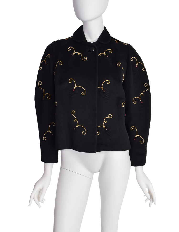 Head over heels for this vintage 1940s insanity by Kay Saks. Featuring the most amazing stiched/quilted/raised caterpillars throughout, which are accented with black and blackened deep red beads, as well as antennae embroidered with gold metal thread. Black hairy wool with single bakelite button closure at rounded collar. Lined. Oversized, boxy, cropped fit. Embodies a surrealist vibe, very Schiaparelli.