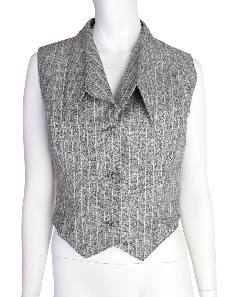 Stunning vintage Lanvin top from the 1980s. This piece lived in our archive for many years and we've finally decided to release her! Grey and beige fleck semi-stiff wool-blend with off-white pinstripes throughout. Cropped, vest/gilet vibe that looks amazing worn as top. The most insane collar that is stitched at the fold, creating an architectural detail that is just lovely. Sexy cross over cropped back with cutout at upper. Ribbed gunmetal button up front.