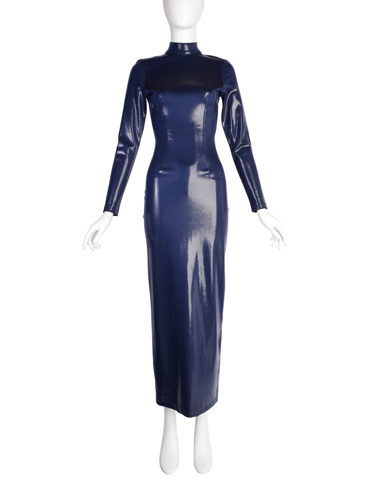 Absolutely amazing vintage 1990s dress by French designer Lili Crepon. Navy blue 'wet look' liquid shine stretch ultra body con maxi dress. So incredibly sexy, very femme fatale - the look of wearing latex without the hassle. Jaw-dropping, completely open back. Mock neck that buttons at the back. Slit at the back bottom of the skirt. Never worn, with original tag still attached.