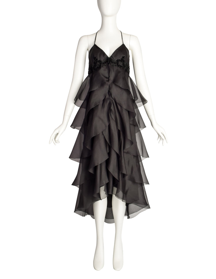 Mira Vintage Black Silk Organza Layered Ruffle Velvet Beaded Applique Halter Dress