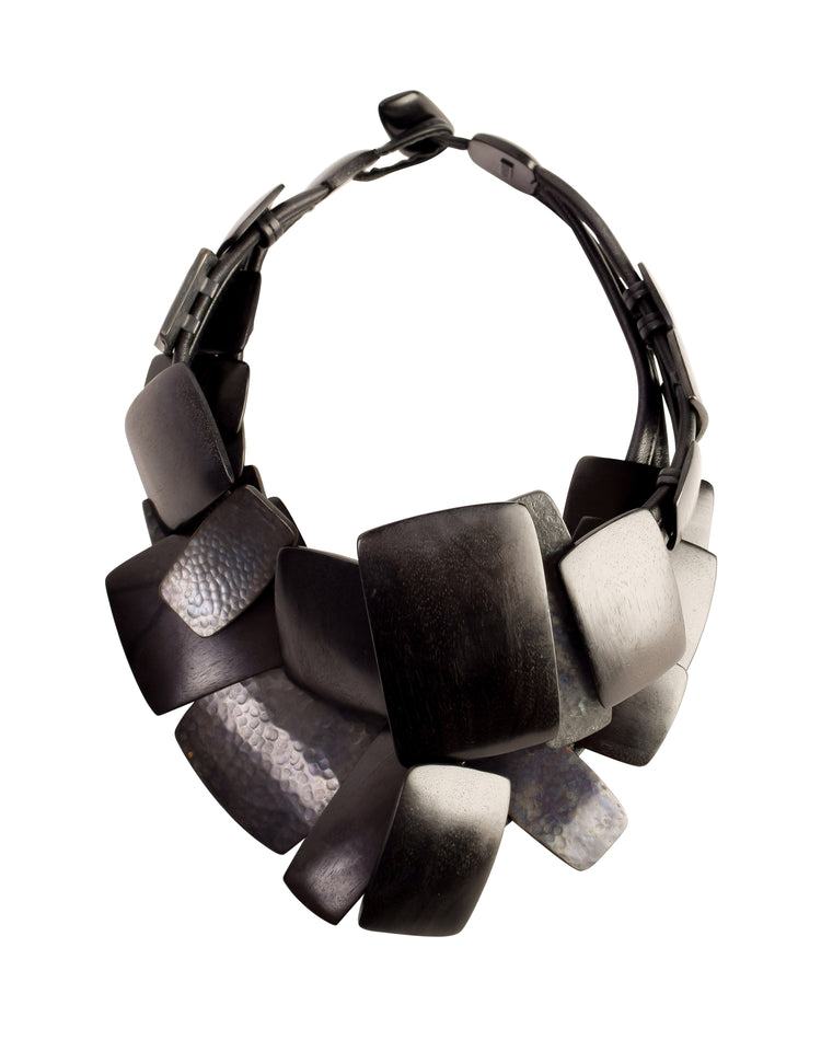 Monies Vintage Oversized Ebony Wood and Hammered Oxidized Gunmetal Plate Necklace
