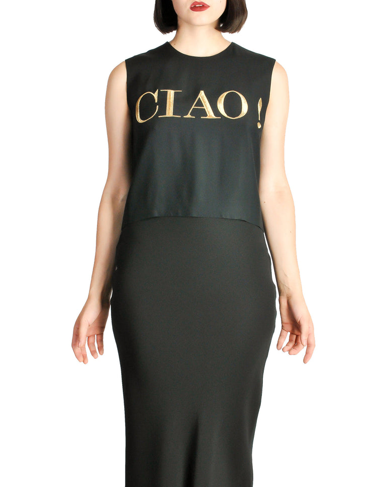 Quirky, fun vintage top from Moschino. Cropped, boxy fit with partial zip up back. Sleeveless, in a silky rayon blend. CIAO! is embroidered in metallic gold thread largely across the front.