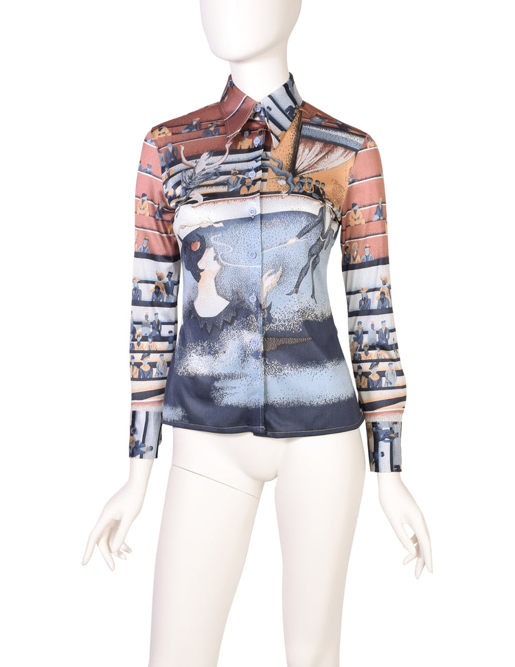 Absolutely incredible vintage 1970s shirt by Nik Nik. This amazing brand is known for their immersive prints from this era, which are highly collectible, and this one is no exception. A full circus, with audience, is on display here... complete with a large clown at the backside. Beautiful color palette consisting of mauve, shades of blue, beiges, and more. Button up front with branded Nik Nik buttons. Dagger collar. Long sleeves with buttoned cuffs. Slinky, shiny nylon jersey.