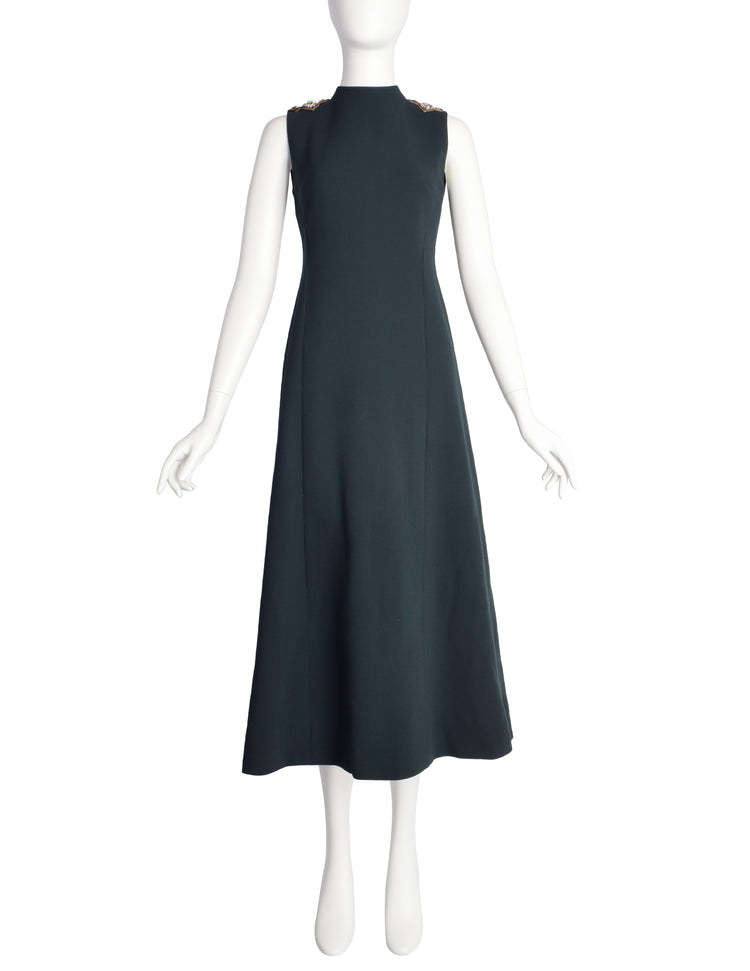 Pauline Trigere Vintage 1960s Mod Deep Green Wool Backless Embellished Shoulder Gown