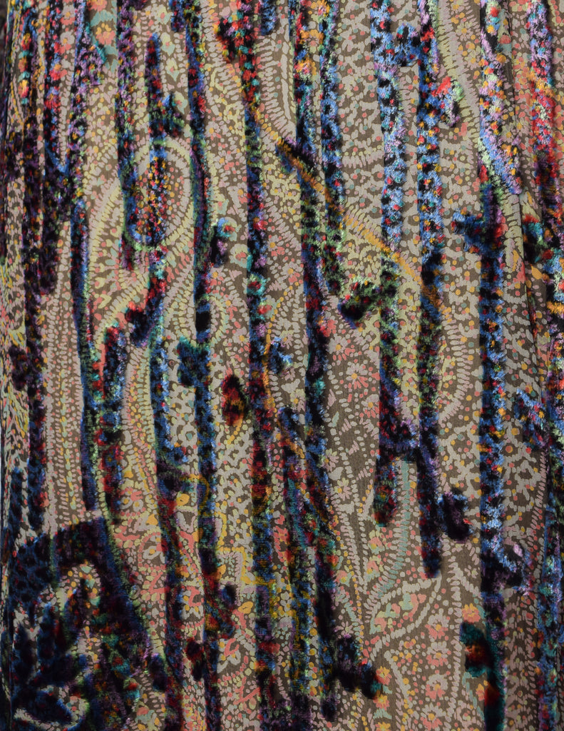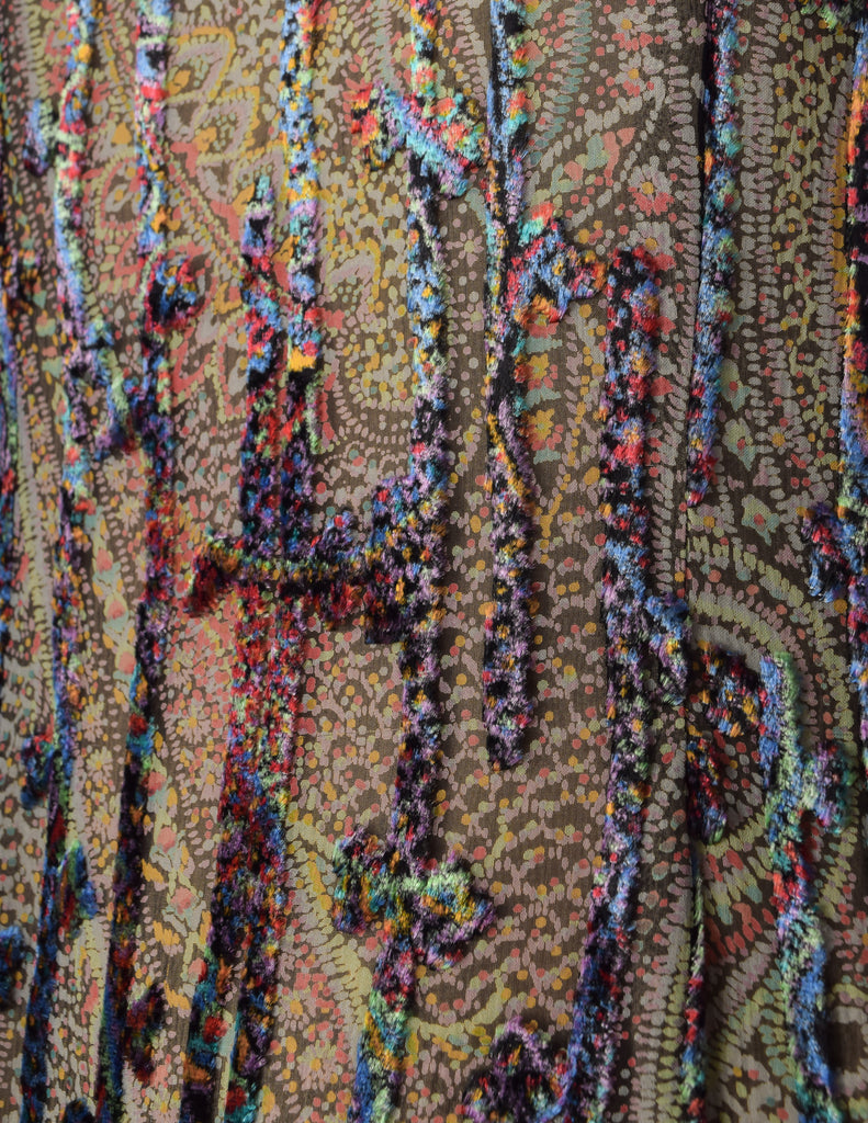 - Beautiful earthy multicolor paisley print silk chiffon with silk velvet damask burnout. Semi-sheer.