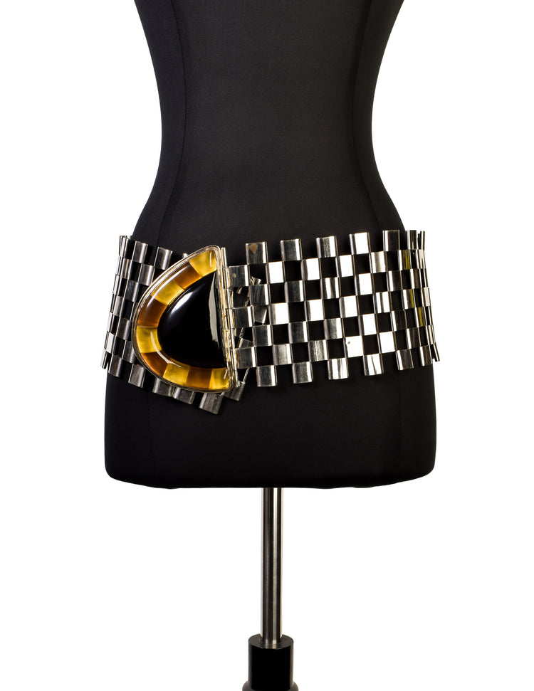 Captivating vintage belt by Perez Sanz, famed art-to-wear NY boutique designer. This incredible piece is from late 90s,and features an eye-catching belt buckle made of poured and rounded resin in yellow, amber, and jet back. Set in 'Alpaca Silver'. Interesting box link style belt, ultra wide. Hooks at the back of the buckle connect well at the end, or anywhere in the links, so you can wear it higher on the waist, or lower on the hips. This piece looks great worn over a dress or white jeans and a tee.